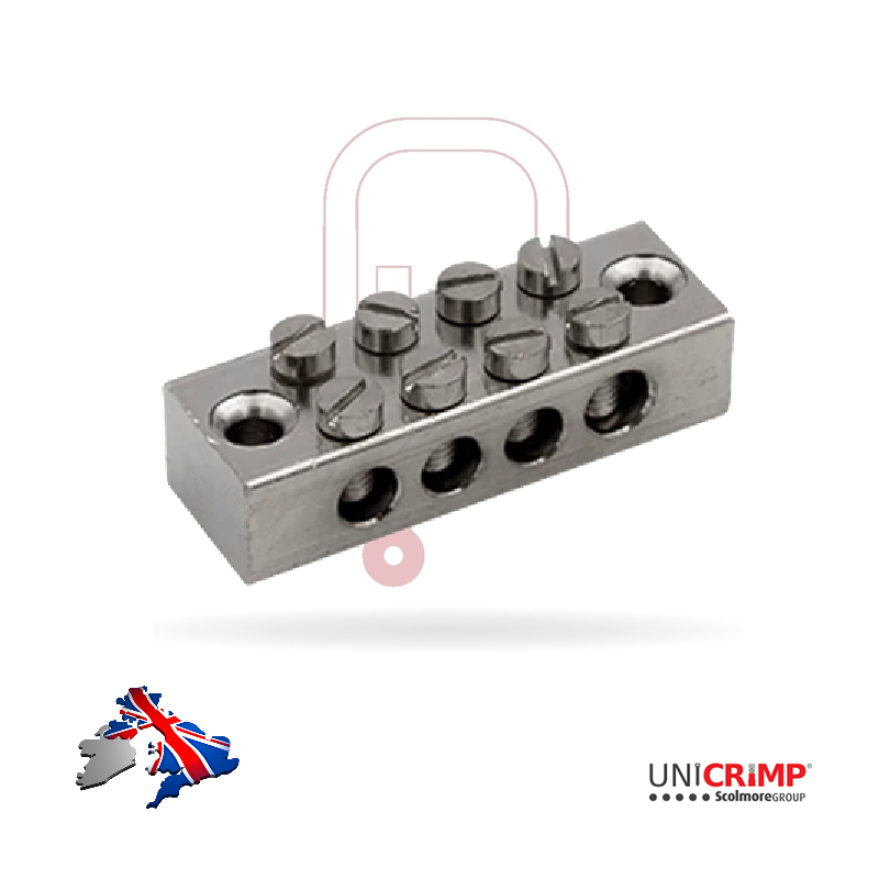 This earth block is a high-quality, 4-way double-pole earth terminal bar designed to provide a secure and organized grounding point within electrical enclosures and consumer units.
